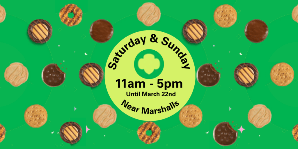 Cookie Sales will be held from 11 a.m. to 5 p.m. Saturday, and Sundays only from February 28th – March 22nd outside near Marshalls.